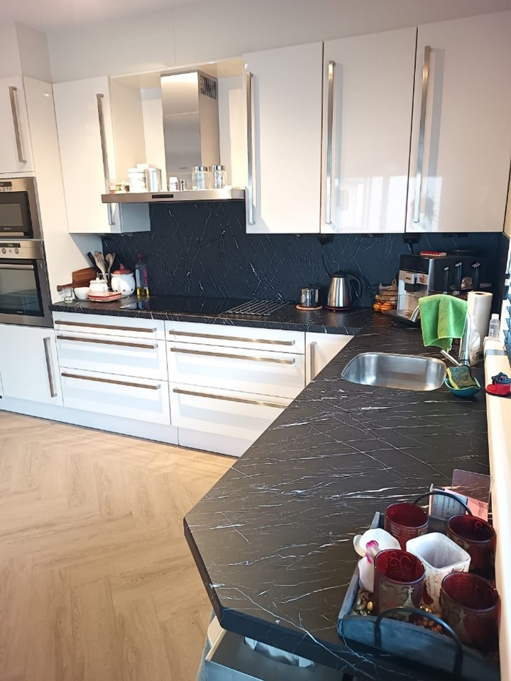 Met de offerte akkoord startte onze monteur het wrapproces. Met precisie bracht hij de U50 Marmeren Folie aan op het aanrechtblad. Deze duurzame folie, bekend om zijn realistische marmertextuur, werd in één dag vakkundig verwerkt.