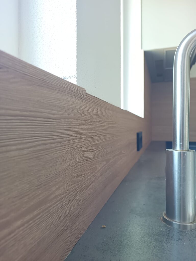 - CT35: Een bruine houtlook folie voor de dibond achterwand, die een robuuste, industriële sfeer toevoegt.