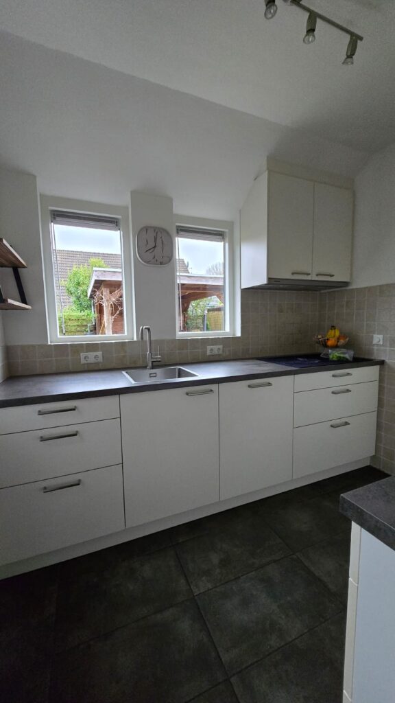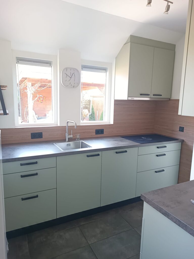 Bij Keukentrend vernieuwen we keukens met hoogwaardige wraps, zonder sloopwerk of hoge kosten. In Oosterhesselen transformeerden we een keuken in twee dagen met RM30 Pastel Olive Green, CT35 houtlook, en matzwarte accenten, inclusief een dibond achterwand. Het resultaat? Een strakke, moderne keuken met industriële charme.