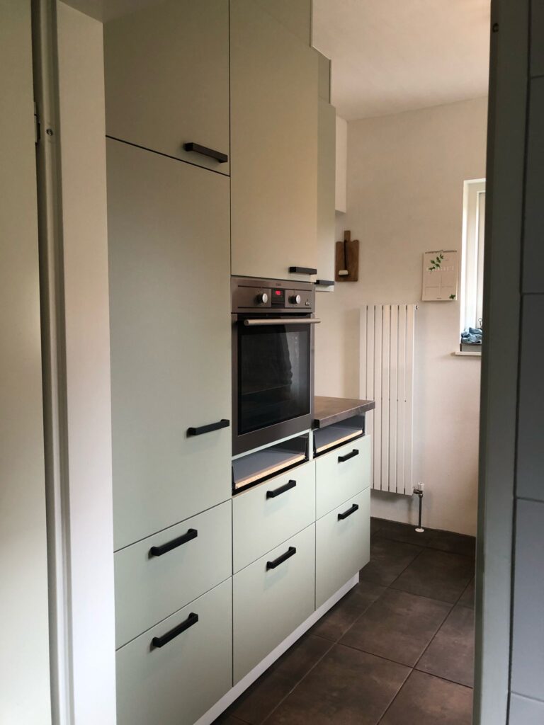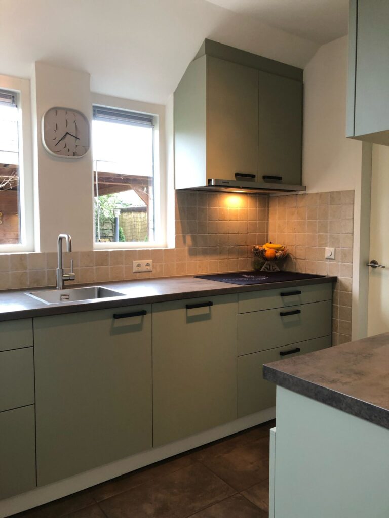 De vernieuwde keuken in Oosterhesselen combineert moderne elegantie met industriële flair. De olijfgroene RM30 Pastel Olive Green fronten zorgen voor warmte, terwijl de CT35 houtlook achterwand en matzwarte accenten een stoere, luxe uitstraling toevoegen. De klant was dolenthousiast over de snelle, stijlvolle make-over.