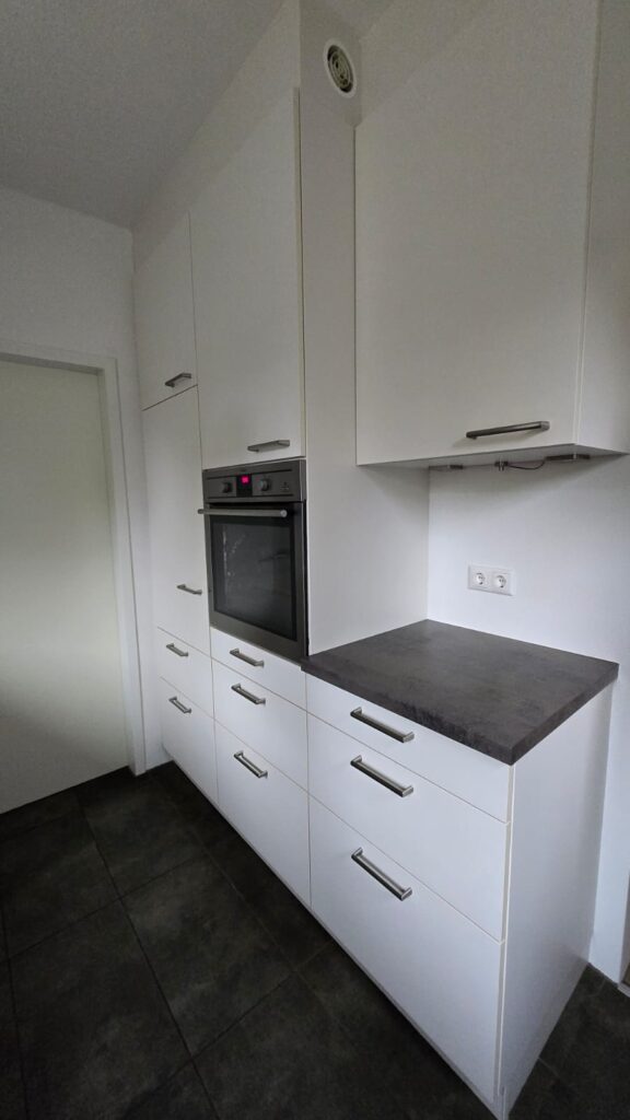 Matzwarte folie werd gebruikt voor de onderplinten, en matzwarte grepen versterkten de minimalistische, moderne stijl.